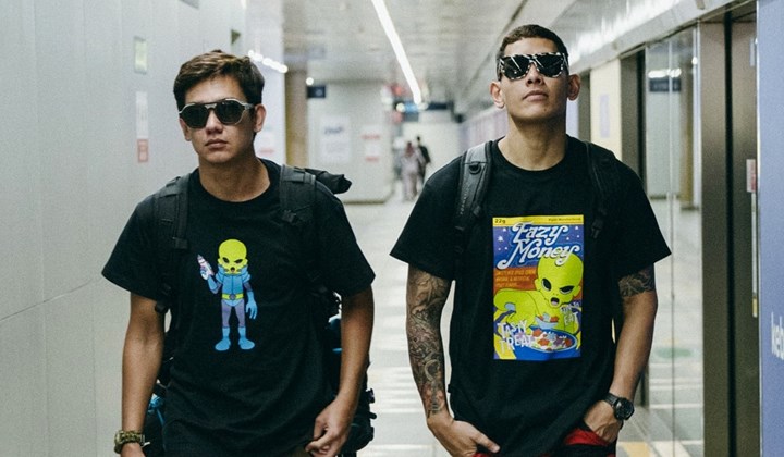 Dalam unggahan itu, Ganindra Bimo mengenakan kaus hitam dipadukan dengan celana bergaris warna hitam merah. Sedangkan Adipati Dolken yang duduk di sebelahnya juga berkaus hitam dan bercelana panjang warna cokelat. Keduanya sama-sama mengenakan kaca mata hitam.