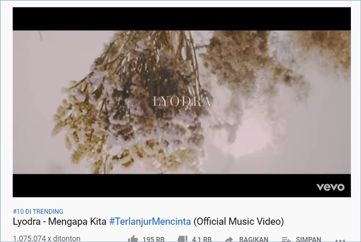 Lyodra 'Idol' berhasil membuat para penikmat musik Indonesia jatuh hati dengan lagu barunya 'Mengapa Kita #TerlanjurMencita' sehingga sukses membuat video klipnya trending kurang dari 24 jam perilisan.