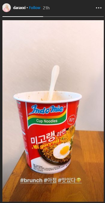 Meski mie merupakan makanan yang sudah lazim di Korea namun kali ini Dara membuat heboh karena merk mie instan kemasan yang dimakannya berasal dari Indonesia yakni Indomie. Terlihat dari bungkus mie yang dipamerkan oleh kakak dari Thunder ini lewat Instagram story-nya.