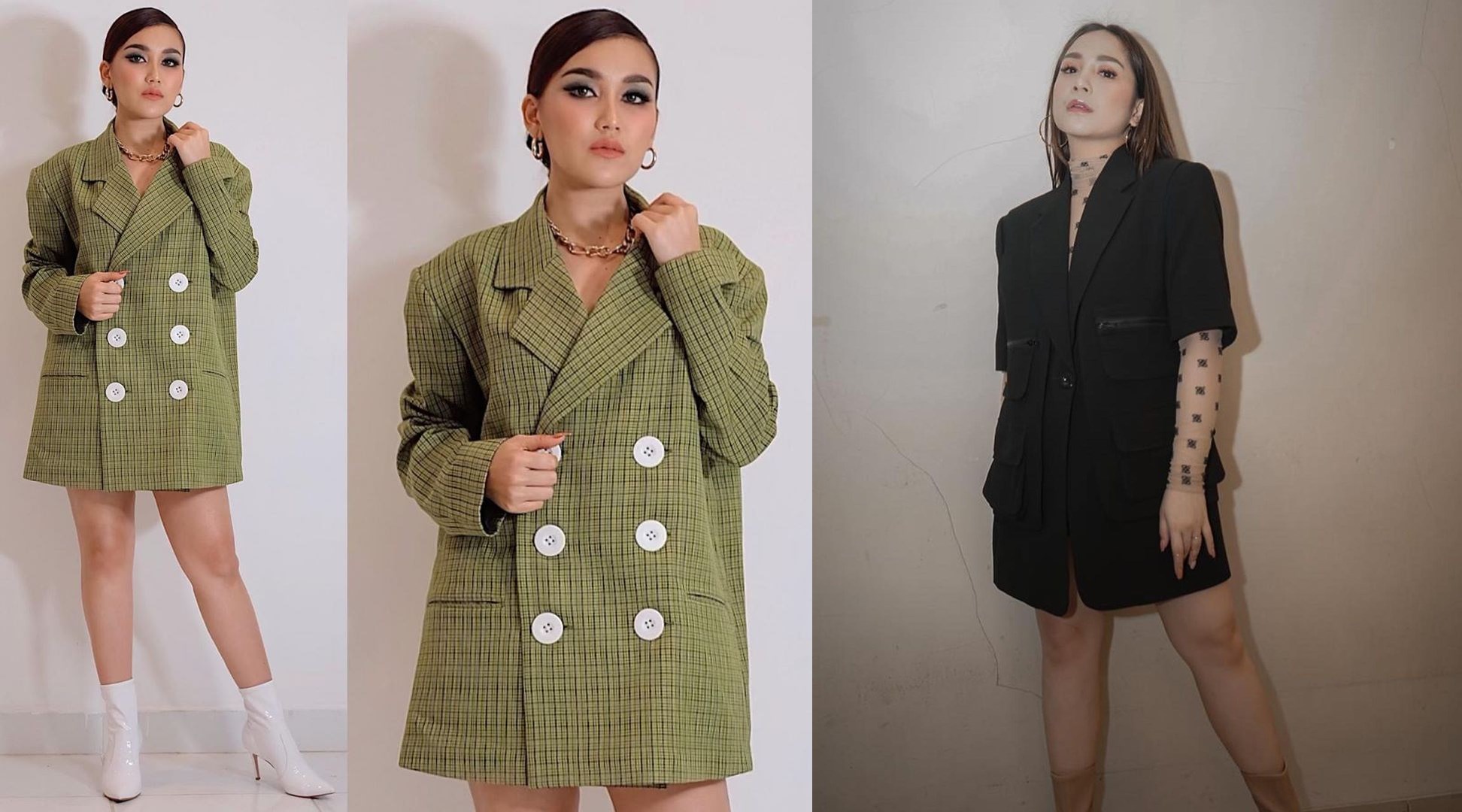Ayu memilih jas warna terang yakni hijau dengan lengan panjang. Kalau Nagita tampil dengan warna hitam dengan lengan pendek, menggunakan kaos warna kulit sebagai dalaman. Ayu dan Nagita sama-sama memadukan dengan sepatu boot semata kaki.