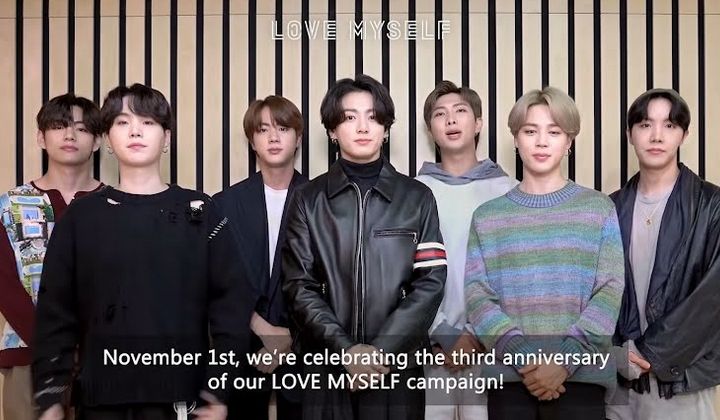 Kanal247.com - Bangtan Boys alias BTS telah mencapai tahun ketiga mereka untuk kampanye "LOVE MYSELF". Dalam kesempatan tersebut, ketujuh member BTS tampil dalam sebuah video untuk memberikan pidato singkat mereka terkait kampanye "LOVE MYSELF" yang banyak membantu penggemar untuk pedulipada diri mereka sendiri.