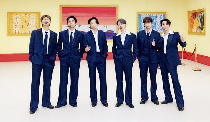 Dalam penampilannya ini, grup asuhan Big Hit Entertainment itu tampil dengan kemeja putih yang dibalut setelan jas biru, memancarkan karisma dewasa dan berkelas. Lagi-lagi netter malah salah fokus pada latar belakang tempat BTS tampil. Mereka terlihat tampil di sebuah ruangan layaknya museum yang dikelilingi sejumlah lukisan.