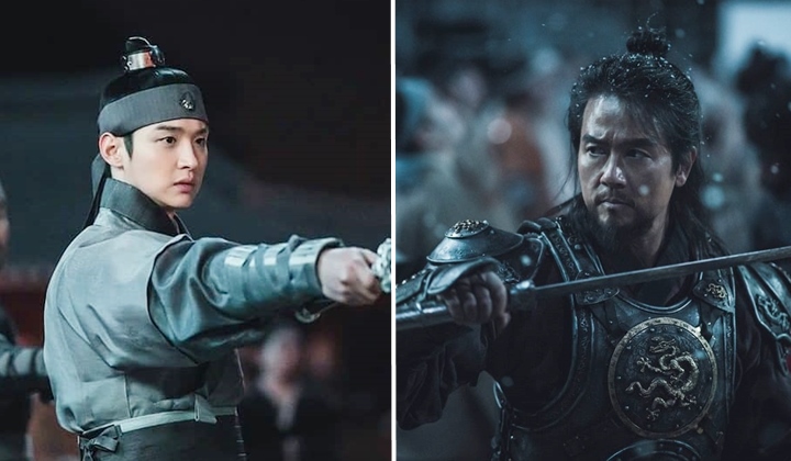 Lalu cuplikan adegan Kam Woo Sung sebagai Taejong tampak memancarkan aura karismatik yang kuat. Matanya yang tajam dipenuhi dengan kekuatan dan tekad. Bahkan di medan perang yang kacau, dia tetap teguh dan berkepala dingin. Dia tidak takut untuk berada di depan pertempuran, dan dia bertarung melawan kejahatan dengan pedang, busur dan anak panahnya.