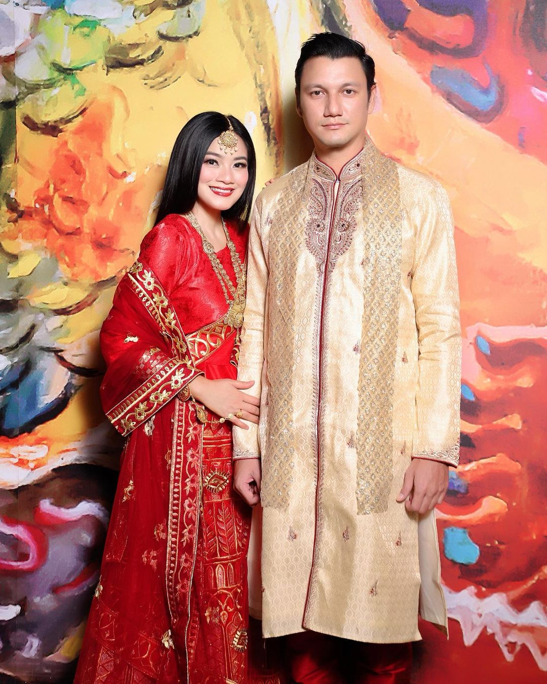 Pasangan selanjutnya yang ikut menyedot banyak perhatian tak lain adalah Titi Kamal dan Christian Sugiono. Titi tampil sangat cantik dengan saree merah begitu juga dengan aksesoris lengkap serta warna bibir yang senada. Sementara sang suami gagah dalam balutan kurta berwarna beige. Keduanya pun ramai dijuluki bak Shahrukh Khan dan Kajol versi lokal.
