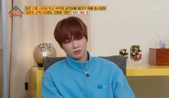 Kang Daniel kemudian menjelaskan, "Dalam aplikasi, anak-anak tidak memfitnah orang tua kalian, tetapi mereka sering mengutuk orang tua kalian. Dan anak-anak itu jahat, dan mereka sangat cerdas. Kalian tidak dapat menjelaskannya di masalahnya adalah bahwa orang tua dan guru tidak tahu apa masalahnya. Mereka mengatakan 'ini hanya konflik antar teman," MC lalu menambahkan, "Aku kira mereka memukulmu dengan cara yang sangat cerdik, jadi kamu bisa 'aku tidak benar-benar mengatakan itu penyerangan'."