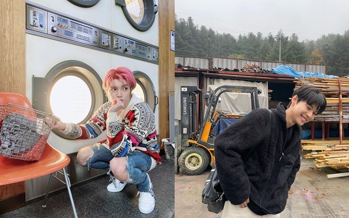 Taeyong dan Doyoung bisa membuat lokasi tak terduga jadi tempat foto menarik. Taeyong abadikan momen depan mesin cuci, sedang Doyoung tampil ceria di depan pabrik kayu.