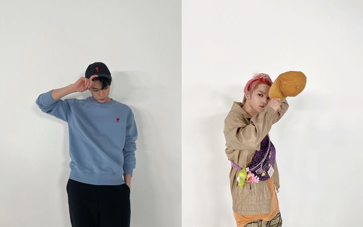 Topi baseball jadi fashion item yang patut dimiliki agar bikin penampilan semakin keren. Doyoung tampil kasual dengan sweater biru, sedang Taeyong kaos oranye dipadukan outer cokelat. Keduanya sama-sama jadikan tembok putih untuk abadikan momen OOTD, nih.