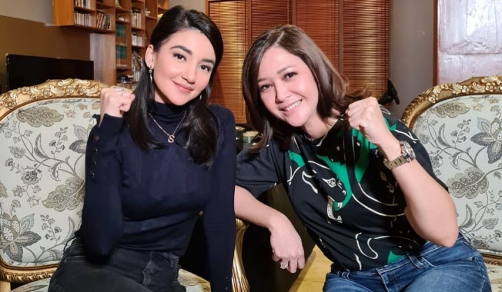 Ibu dua anak itu tampak mengenakan atas lengan panjang hitam polos dan bawahan berwarna senada. Maia pun tampak duduk di sampingnya mengepalkan tangan pertanda menyemangati.