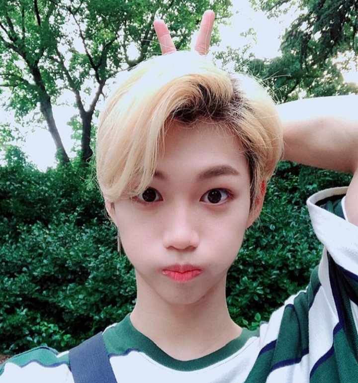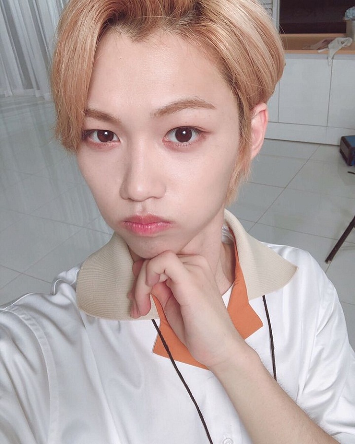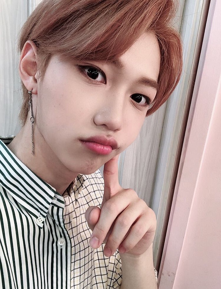 Dengan gaya peace andalannya Felix berpose dengan imut. Pria penyuka sepak bola ini juga memiringkan kepala dan menggembungkan pipinya ke kanan. Duh cute overload banget sih Felix!