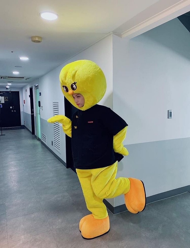Selain kerap mengeluarkan aegyo alias jurus imut, Felix juga bisa bertingkah kocak lho. Dalam balutan kostum ayam tersebut, pose Felix sukses mengundang tawa. Posenya lucu nan menggemaskan.