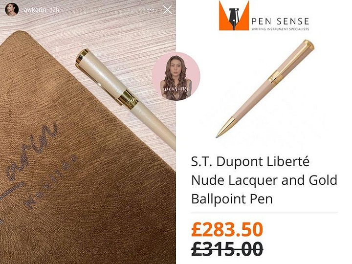 Awkarin pernah membeli pena seharga Rp6.058.000 yang merupakan keluaran perusahaan manufaktur ternama asal Prancis, S.T. Dupont. Pena seri Liberte Nude Lacquer and Gold yang dibeli Awkarin itu sukses membuat netizen meratapi nasib pena-nya masing-masing.