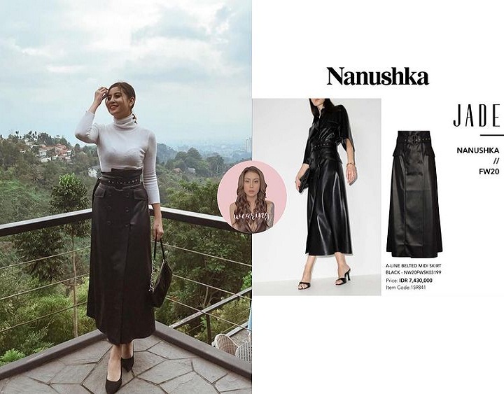Saat berlibur ke puncak, Awkarin memakai rok hitam berbahan kulit yang kian membuat penampilannya menarik. A-line Belted Midi Skirt Black yang dipakai Awkarin harganya Rp7.430.000.