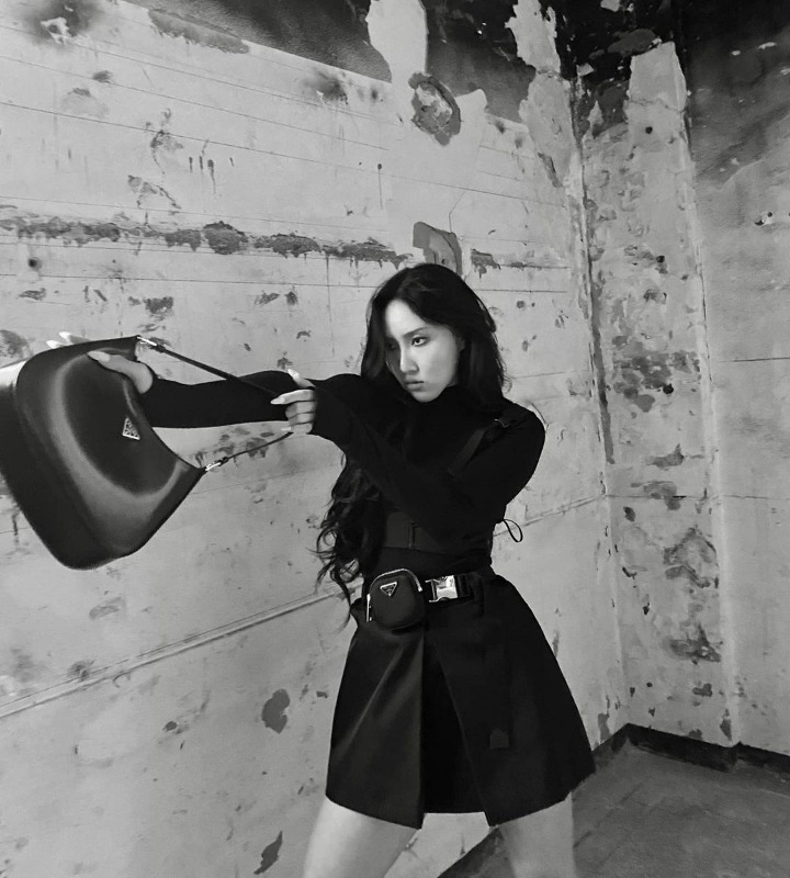 Memiliki kualitas suara yang khas hingga mampu mencapai high notes, Hwasa juga kerap mengisi bagian rap untuk beberapa lagu MAMAMOO. Ia tampak keren saat menguraikan rambutnya apalagi dengan gaya menembak menggunakan tas seperti potret kali ini.