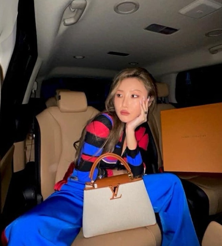 Kali ini, Hwasa tampak memamerkan tas mahalnya saat ia sedang berada di dalam mobil. Potret ala candid membuatnya semakin cool apalagi mengenakan atasan dengan perpaduan garis berwarna hitam, biru, dan pink.