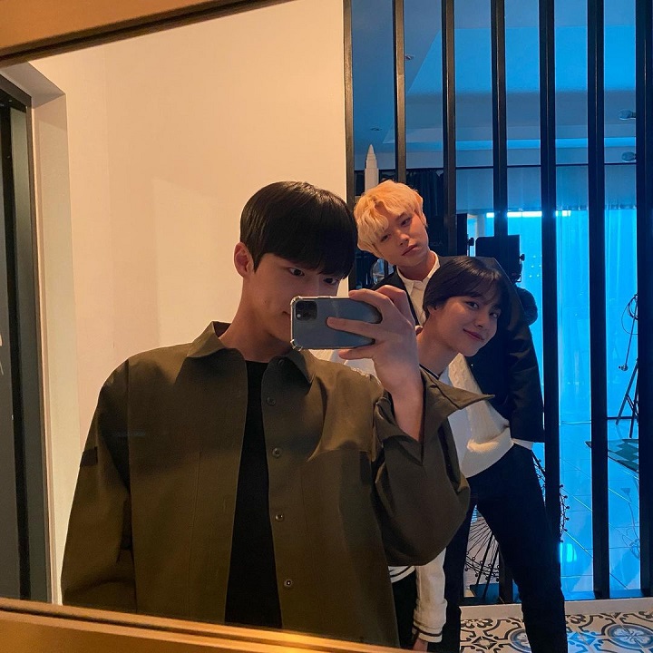 Pria yang berada di bawah naungan agensi Fides Spatium ini kerap kali menunjukkan kedekatan dengan lawan mainnya. Kali ini, ia membagikan potret dirinya melakukan mirror selfie bersama Kang Min Ah dan Park Ji Hoon di drama on going, "At A Distance, Spring Is Green".
