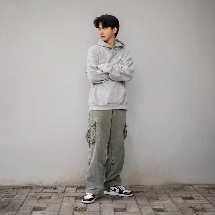 Laki-laki berusia 19 tahun ini semakin dikenal sejak beradu akting di film "Terlalu Tampan". Ari Irham diketahui sering memakai outfit ala hip hop atau oversize. Di potret ini, ia terlihat keren memadukan hoodie berwarna abu-abu muda, celana jeans abu-abu model cargo, dan sepatu Nike warna hitam putih.