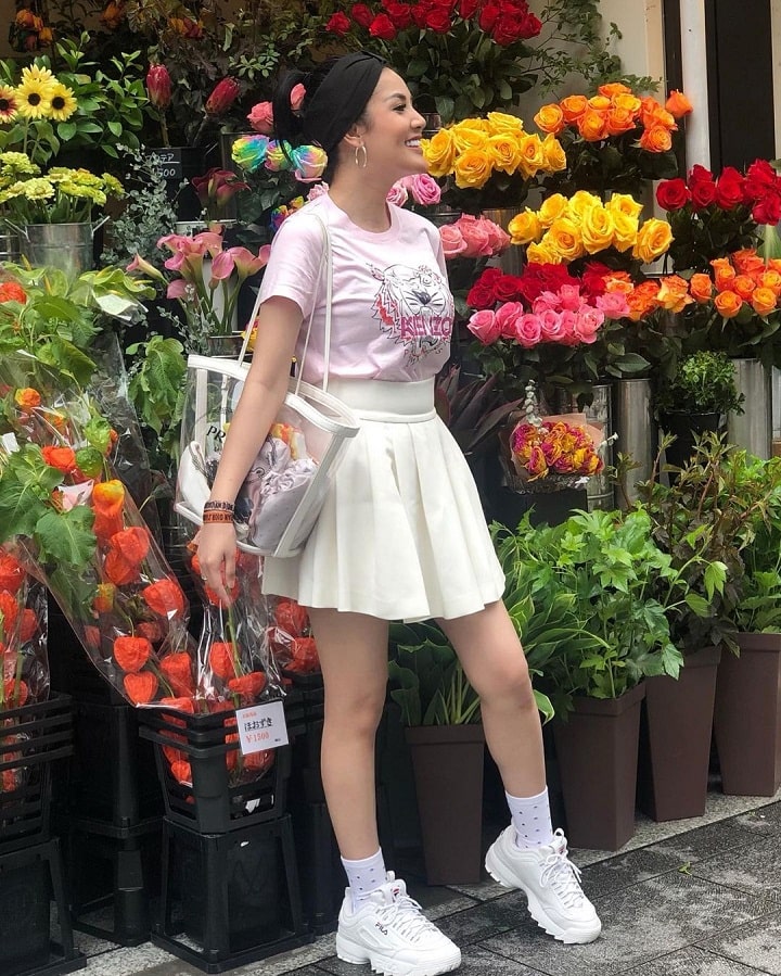 Nindy tampil menggemaskan dengan balutan rok lipit dan kaos polos. Alih-alih terlihat bak ibu-ibu dua anak, Nindy malah seperti berusia 20-an. Gaya busana yang cocok memang akan menampilkan kesan tertentu pada si pemakai. Gimana menurut kalian gaya busana Nindy yang satu ini?
