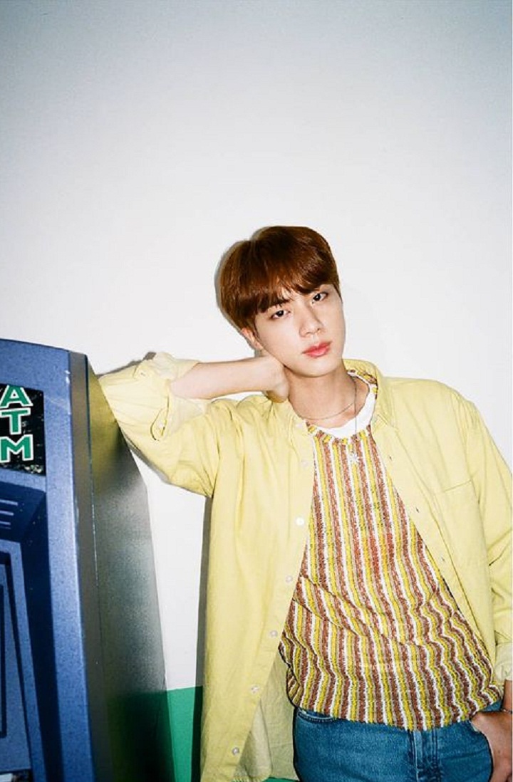 Jin tampil penuh warna dengan kemeja kuning dan kaos bergaris senada. Penampilan mempesona ini rupanya untuk teaser foto lagu BTS yang bertajuk "Dynamite". Gaya busana penuh warna ini membuat kharisma Jin kian terpancar kan?