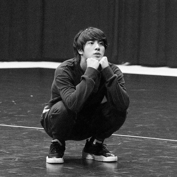 Jin terlihat berjongkok dengan tatapan lurus kedepan. Idol berusia 28 tahun itu juga menopang dagunya dengan kedua tangan yang dikepalkan. Potret ini sukses membuat penggemarnya menjerit heboh karena duality Jin. Pelantun "Boy With Luv" ini terlihat imut dan keren di saat bersamaan.