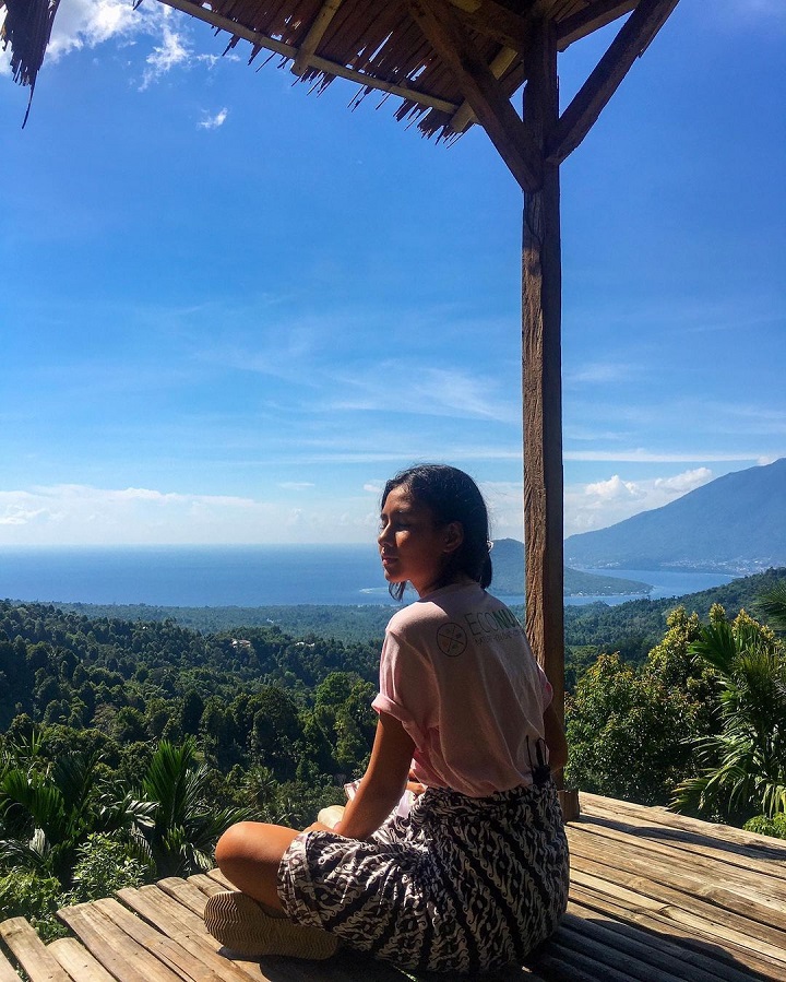 Selayaknya manusia biasa, Shenina ternyata juga memiliki hobi traveling. Kali ini, destinasi wisata yang menjadi jujukan mengisi waktu luangnya adalah Kepulauan Tidore, Maluku Utara. Shenina tampak menikmati sinar mentari di siang hari sembari menikmati pemandangan rimbunan pepohonan di depannya. Sungguh indah!