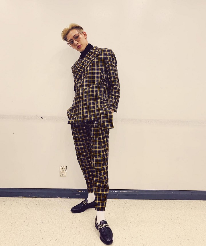 Kerap kali tampil dengan berbagai aksesoris, kali ini BamBam tampak rapi dan memukau dengan outfit semi formal. Idol berzodiak Taurus ini memadukan satu setelan jas dan celana bermotif kotak-kotak, sweater turtle neck hitam, sepatu loafers hitam, serta kacamata frame kotak. Sangat keren!