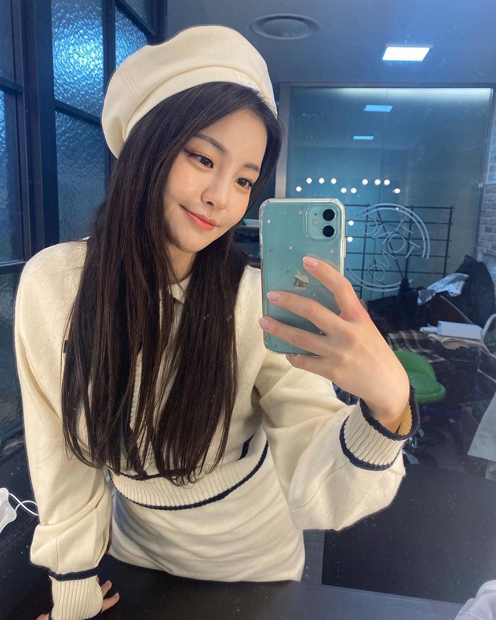 Yujeong merupakan member Brave Girls yang gemar melakukan selfie dan mengunggahnya di Instagram. Kali ini, idol berzodiak Taurus ini tampak melakukan mirror selfie menggunakan ponsel pribadinya. Yujeong tampak tersenyum manis selaras dengan outfit lucu yang dikenakannya.