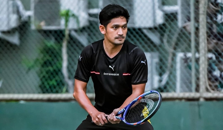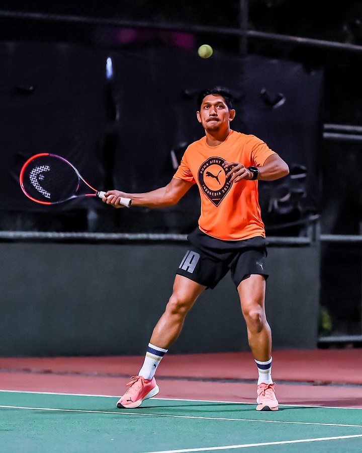 Selain berolahraga lari dan sepak bola, Ibnu Jamil juga gemar menggeluti tennis di sela kesibukannya. Berbalut pakaian olahraga merek Puma, ia tampak fokus dan siap menanti datangnya bola tennis ke arahnya. Postur defense yang dilakukan oleh Ibnu Jamil terasa seperti seorang atlet. Keren banget!