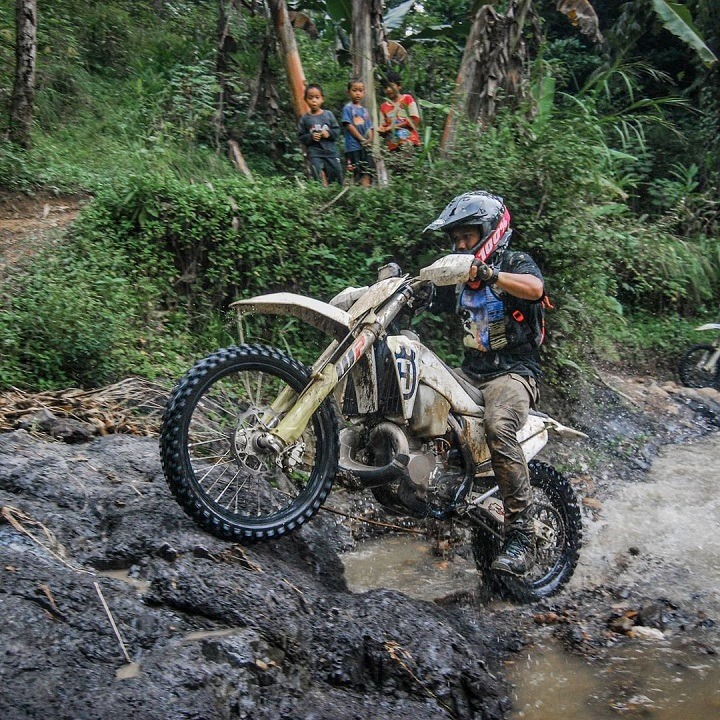 Selain gemar berolahraga, Ibnu Jamil juga sangat menyukai adventure. Ia bahkan sering melakukan touring menaiki sebuah motor seperti kali ini. Berbekal motor trail yang sudah bercampur lumpur, Ibnu Jamil tampak fokus berusaha melalui jalur bebatuan yang dipenuhi air. Menegangkan!