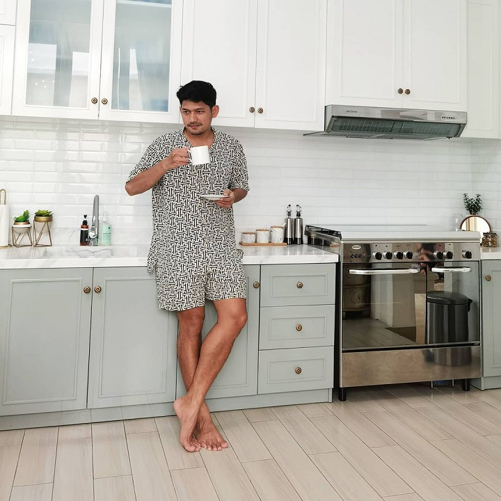 Di waktu senggangnya, pria berzodiak Taurus ini memilih untuk bersantai seperti layaknya manusia biasa. Ibnu Jamil terlihat masih mengenakan piyama sembari berpose membawa sebuah cangkir. Ia tampak bersandar di dapur rumahnya yang bernuansa hijau kalem dan putih.