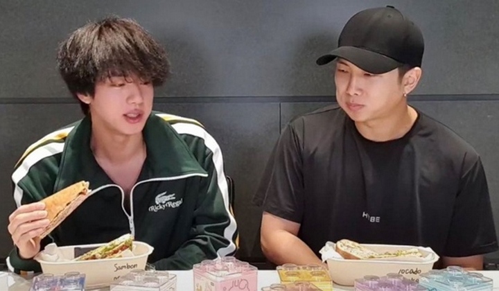 Sebelum melakukan review, Jin dan RM memastikan bahwa kue didepan mereka bukanlah endorse. Setelah membaca nama menu sandwich, mereka mengomentari penampilan visual dari kue yang akan dimakan.