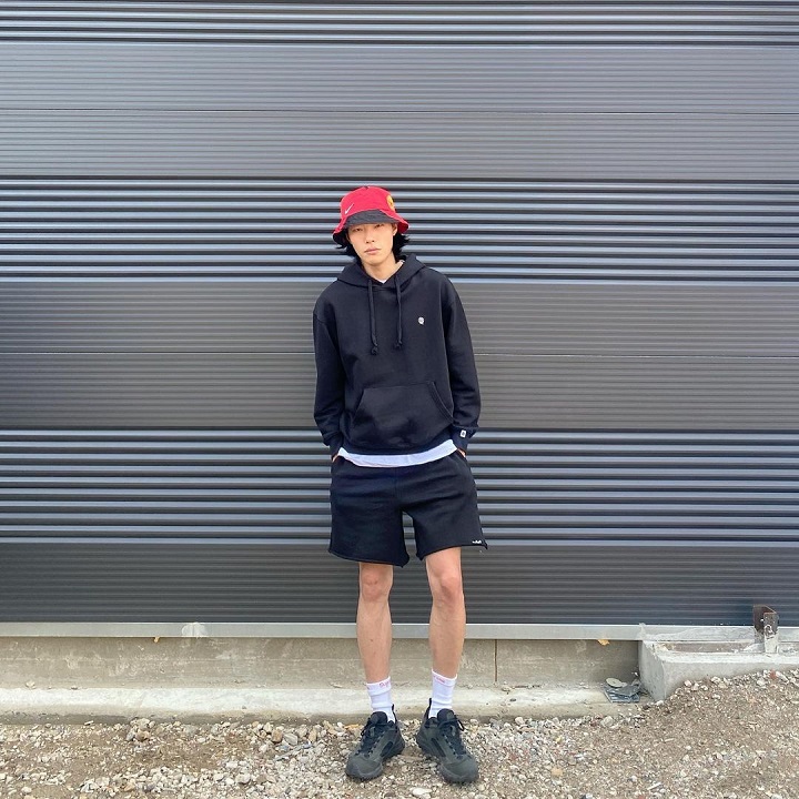 Ryu Jun Yeol tampak mengenakan OOTD dengan gaya hiphop yang keren. Ia memadukan t-shirt berwarna abu-abu, hoodie polos warna hitam, celana pendek hitam, dan sepatu hitam. Untuk melengkapi style hiphopnya, Ryu Jun Yeol juga mengenakan bucket hat merek Nike dominan berwarna merah. Stylish banget!