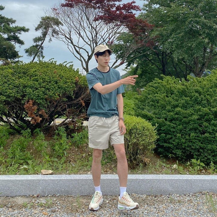 Gaya OOTD yang simpel dan nyaman sepertinya sudah menjadi andalan seorang Ryu Jun Yeol. Seperti yang satu ini, ia tampak mengenakan t-shirt motif garis-garis perpaduan warna hijau kalem dan hitam, celana pendek warna krem, sneakers warna krem, serta topi yang juga berwarna krem.