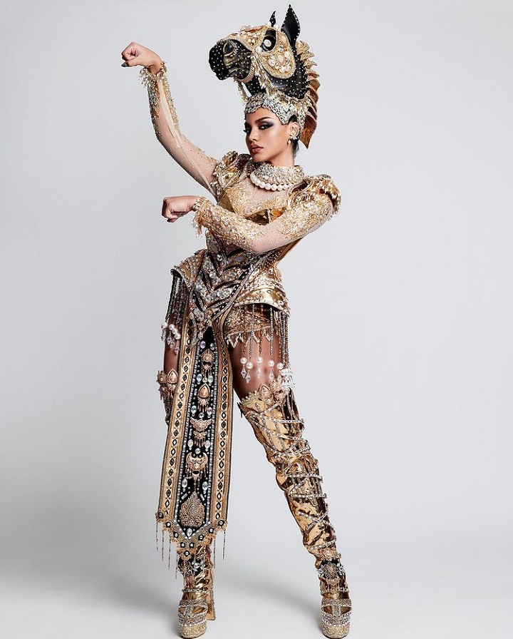 Kostum nasional tersebut memiliki kesan mewah dengan konsep desain warna gold. Tak sembarangan, konsep gold tersebut rupanya melambangkan kekuatan dan kemuliaan. Di sisi lain, busana nasional bertema kuda tersebut dilapisi dengan berlian.