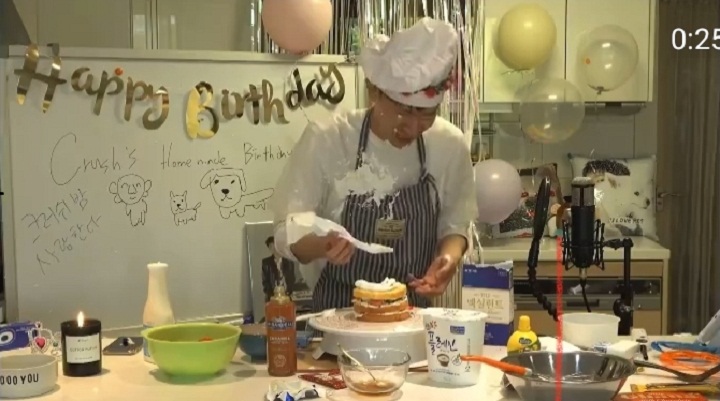 Crush dalam potret di atas tampak riang membuat sebuah kue. Dia dengan santai mengoleskan krim putih pada kue yang telah dibuatnya. Namun karena terlalu kuat memegang krim, hal yang lucu pun terjadi. Krim tersebut menyembur ke wajah dan apron Crush.