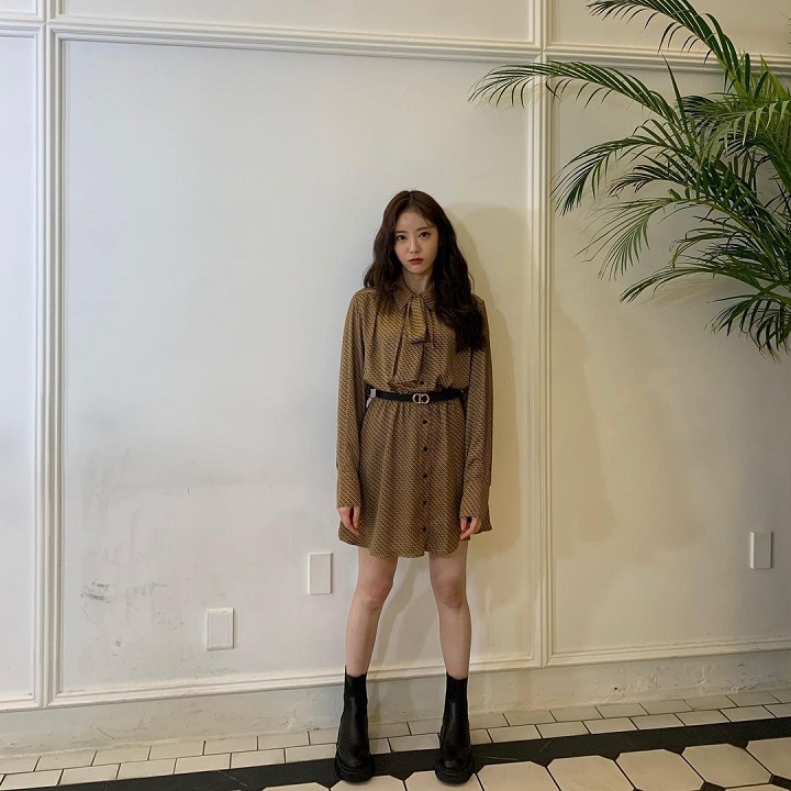 Sebagai seorang idol, Luda tentu menganggap OOTD sebagai sesuatu yang penting. Kali ini ia tampak stylish dengan memadukan dress motif berwarna espresso, belt tipis hitam, dan sepatu boots warna hitam. Tak ketinggalan, Luda juga mengurai rambut ombaknya.