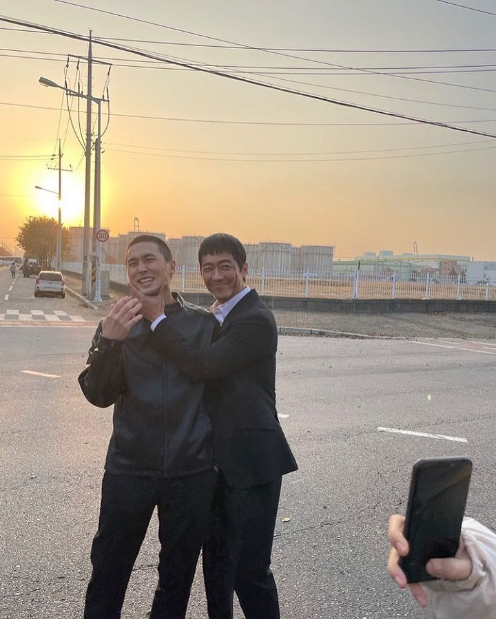 Nam Goong Min tampak ramah dan hangat dengan rekan lawan mainnya di drama. Dalam potret di atas, Nam Goong Min tampak memeluk serta memegang dagu rekannya itu. Berlumuran properti darah palsu di dahi, Nam Goong Min tersenyum serta bercanda ria dengan sang teman.