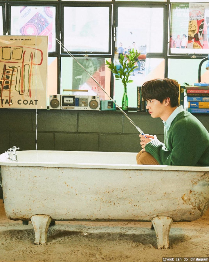 Tingkah laku Sungjae memang selalu sukses membuat penggemar gemas, seperti yang satu ini. Bintang drama "Plus Nine Boys" itu tampak sedang memancing di bathtub. Sungjae mengenakan sweater hijau sembari memegang alat pancing dan menatap ke depan. Gemas banget!