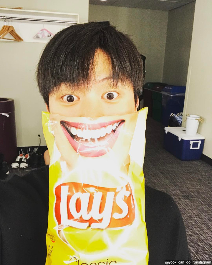 Idol kelahiran tahun 1995 itu ternyata memiliki sisi humoris juga lho. Dalam potret di atas, Sungjae tampak berfoto dengan memegang sebuah makanan bergambar mulut tersenyum lebar. Menaruhnya di wajah, Sungjae pun sukses membuat pemandangan yang kocak.
