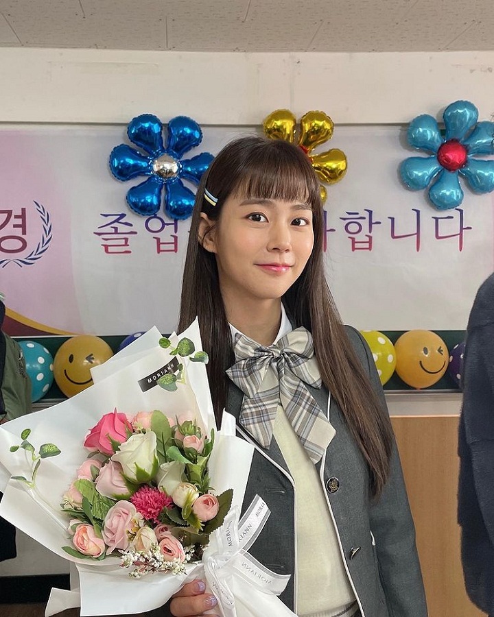Han Seung-yeon unyu dalam balutan seragam sekolah dan gaya rambut baru. Dia mengenakan seragam khas Korea Selatan dan menata rambutnya dengan potongan lurus disertai poni tengah. Han Seung-yeon semakin manis dengan jepitan rambut yang menempel di kepala cantiknya.
