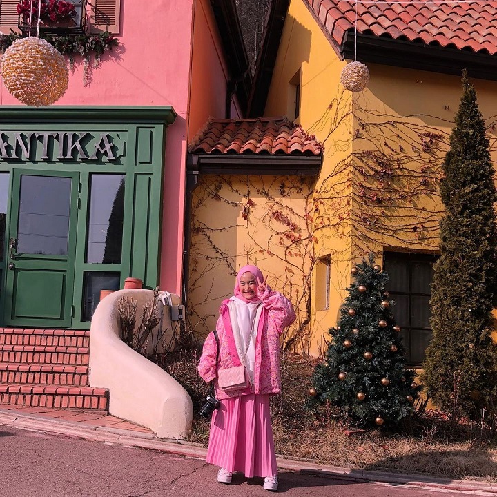 Saat berkesempatan mengunjungi Petite France In Korea, penyanyi bersuara khas ini memadupadankan outfit yang cerah. Fatin mengenakan blouse berwarna putih dengan jaket tebal bermotif bunga, rok plisket, hijab pashmina, dan sepatu yang seluruhnya berwarna pink. Tak ketinggalan, ia juga mengenakan tas selempang berwarna serupa dengan OOTD-nya.