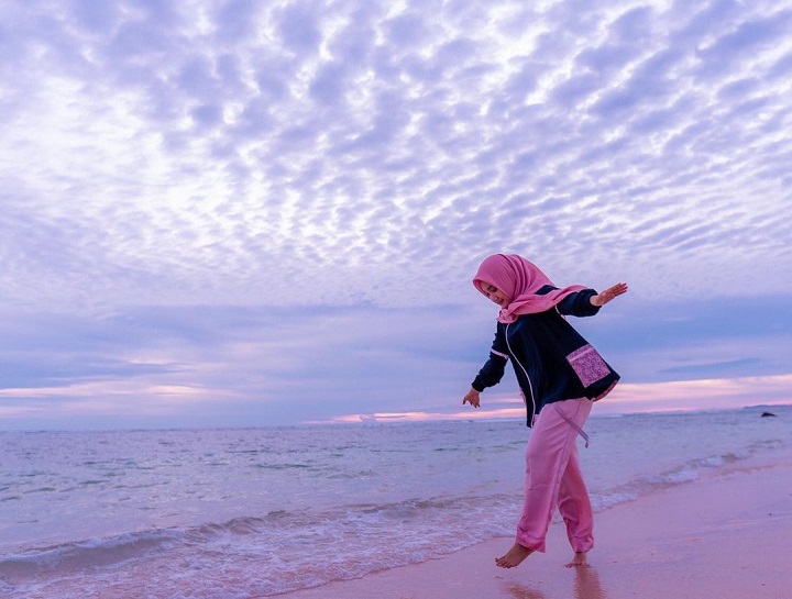 Pelantun lagu "Pelangi dan Hujan" ini tetap mengenakan outfit yang nyaman saat berlibur. Berlokasi di Pantai Lhoknga, Banda Aceh, Fatin terlihat asyik bermain di atas pasir sembari memadukan outer navy merek Zoya dengan celana panjang dan hijab paris pink. Fatin memang penyuka warna cerah maka tak heran jika OOTD-nya kerap kali colorful.