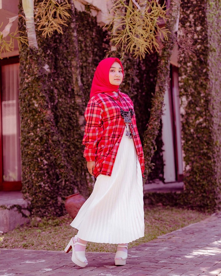 Fatin dikenal selalu tampil paripurna dengan gaya fashion yang kece termasuk di potret ini. Pelantun lagu "Dia Dia Dia" ini memadukan OOTD stylish yaitu gamis panjang warna putih, kemeja motif kotak-kotak dan hijab paris merah, serta heels cokelat susu. Fatin terlihat semakin menawan dengan kalung besar yang dikenakannya.