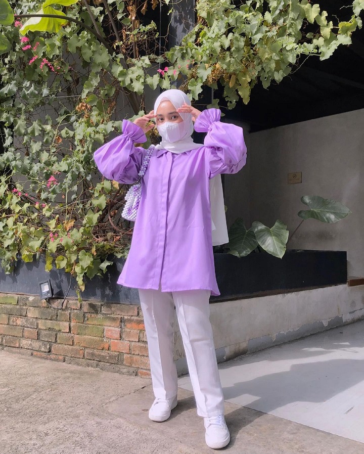 Seolah tak ingin ketinggalan zaman, pelantun lagu "Salahkah Aku Terlalu Mencintaimu" ini juga mengenakan outfit kekinian ala anak muda. Fatin memadukan blouse lengan balon soft ungu dengan celana, hijab pashmina, dan sepatu yang seluruhnya berwarna putih. Fatin juga tak lupa menambahkan masker model duck bill di OOTD bergaya casual look-nya itu.
