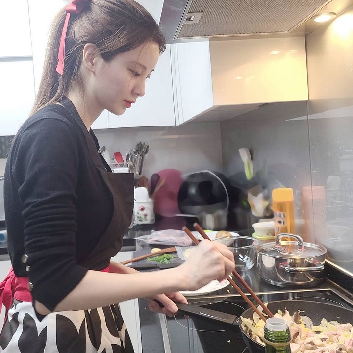 Memiliki segudang talenta, siapa sangka jika ternyata Seohyun juga berbakat dalam memasak. Ia kerap kali membagikan kebolehannya itu ke Instagram pribadinya seperti kali ini. Seohyun tampak manis berbalut celemek sembari fokus memasak menu steak cream cheese tteokbokki.