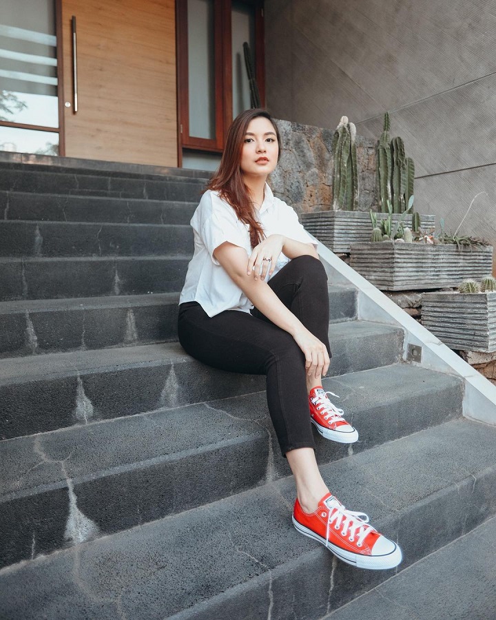 Meski sudah memiliki dua anak, namun pesinetron "Matahariku" ini tetap bisa bergaya kasual bak ABG. Sembari berpose fierce, Chelsea memadukan kemeja lengan pendek berwarna putih, skinny pants hitam, serta sepatu Converse merah. Jika sudah berpenampilan begini siapa yang akan menyangka jika Chelsea merupakan seorang ibu-ibu?