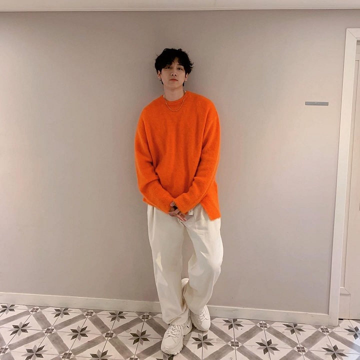Maknae dari boygroup VIXX ini kerap kali mengenakan outfit yang bernuansa monokrom. Kali ini, Hyuk tampil berbeda dengan OOTD style hiphop. Ia memadukan sweater oversize berwarna oren cerah serta baggy pants dan sepatu putih. Hyuk semakin terlihat keren dengan sebuah kalung sederhana yang melingkar di lehernya.