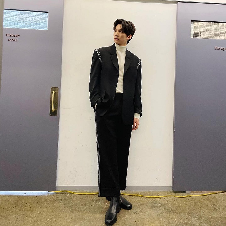 Memiliki tinggi 184 cm membuat Hyuk terlihat cocok melakukan mix and match berbagai outfit. Kali ini, idol berzodiak Cancer ini tampil rapi dengan perpaduan sweater turtle neck berwarna putih tulang, setelan jas, celana, dan sepatu chelsea boots hitam. Hyuk semakin terlihat tampan dengan model rambut yang dibelah tengah.