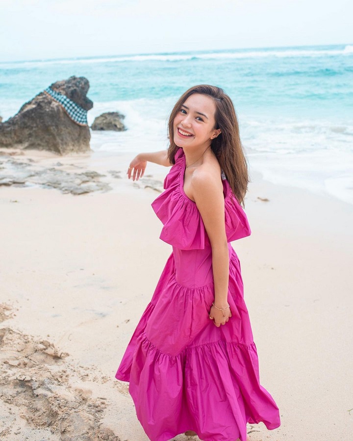 Seperti manusia biasa lain, Beby Tsabina juga tak bisa menyembunyikan perasaan bahagianya kala mengunjungi pantai. Pesinetron "Anak Jalanan" ini tampak tersenyum lebar saat menginjakkan kaki di atas pasir yang lembut. Beby Tsabina rupanya sedang berada di Karma Kandara Beach, Bali.
