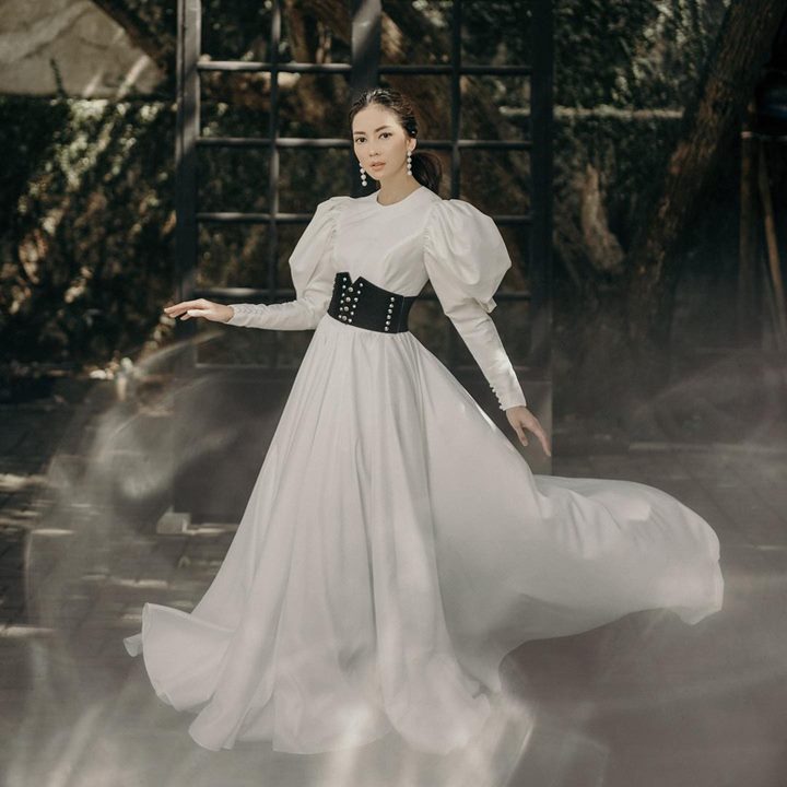 Ririn tampil elegan bak ratu dalam balutan dress putih menjuntai lebar. Pesinetron kelahiran Malang itu lantas berpose elegan dengan kedua tangan mengambang di udara. Ririn juga menatap lurus ke arah kamera.
