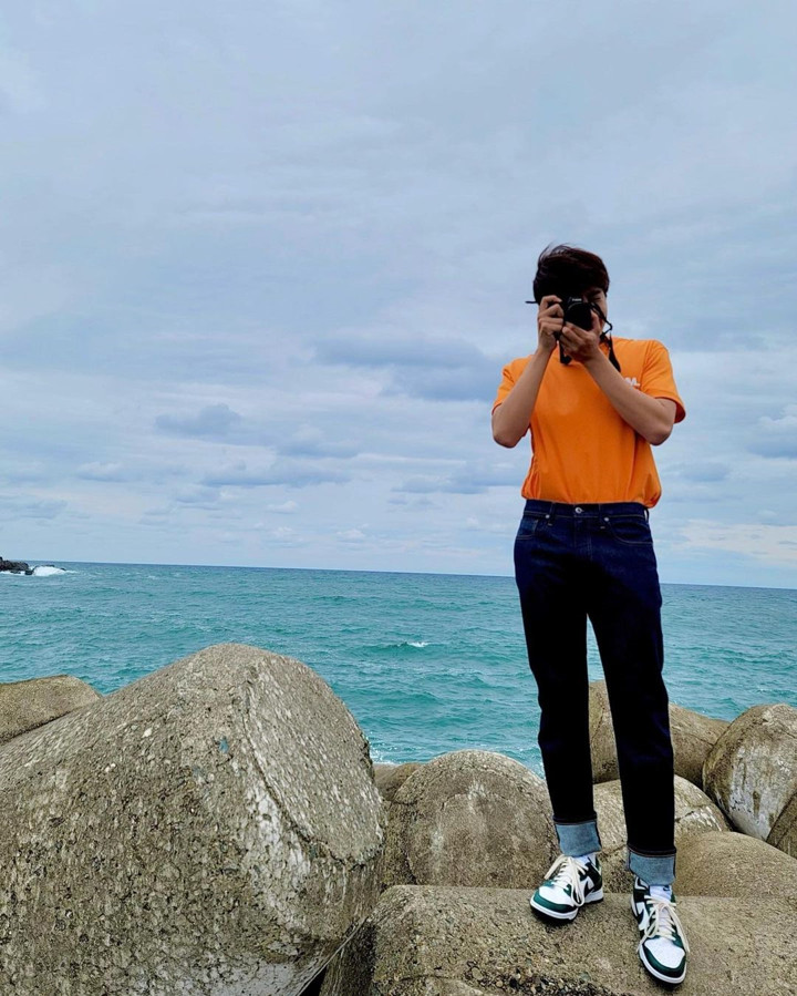 Super catchy, Kim Seon Ho memadukan kaos putih, celana army serta boots hitam-oren. Ia lantas dengan tenang menikmati suasana alam yang damai sembari duduk disebuah bangku dengan pose rebahan.
